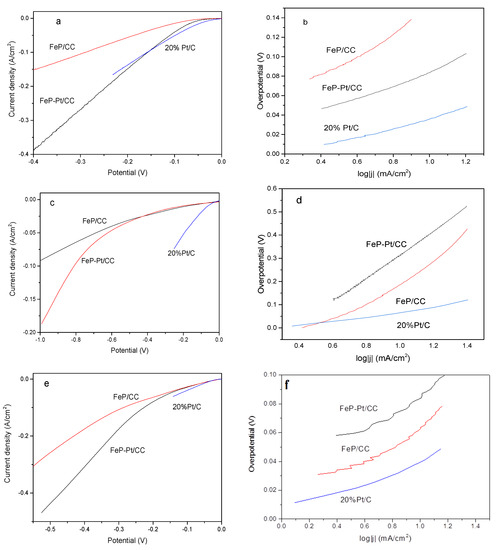 The electrocatalytic performances of FeP-Pt/CC and FeP/CC were investigated by a Princeton electrochemical workstation. All HER measurements were carried out at 25 °C. The results are given in Figure 5. It can be seen from Figure 5a that FeP-Pt/CC and FeP/CC possesses over-potentials of −58 mV and −110 mV reach the cathode current density of 10 mA·cm−2 in 0.5 M H2SO4, while 20% Pt/C has the smallest η10 (−36 mV). Their corresponding Tafel slope is 49.6, 70.6, 108.6 mV/dec. Tafel slopes suggest that the Volmer reaction is fast and the rate-limiting step is the Heyrovsky reaction. It shows that the addition of platinum greatly improves the hydrogen evolution performance of FeP. However, in the phosphate buffer solution, the hydrogen evolution performance is poor, η10 of FeP-Pt/CC, FeP/CC and Pt/C is −214, −187, −60 mV, respectively. The corresponding Tafel slope are 256, 510, 105.5 mV/dec. At a higher potential, platinum can improve the HER performance of FeP greatly, even more than 20% Pt/C. A neutral-effective electrocatalyst has apparently the best benefit of environmental benignity and very broad application prospects. Alkaline-efficient electrocatalysts are the most important and widely used technology in the industry. From Figure 5e, we can find that 20%Pt/C exhibits excellent electrocatalytic activity in 1 m KOH. η10 of FeP-Pt/CC and FeP/CC are −42.6, −44 mV, respectively. The corresponding Tafel slopes are 80, 60.5 mV/dec. LSV of FeP-Pt/CC has been very close to Pt/C catalyst. It shows that FeP-Pt/CC has a good application prospect.