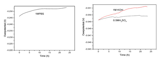 Time dependence of Overpotential for NiCo2Px at 10 mA/cm2 (in 0.5 M H2SO4, 1 M KOH and 1 M PBS).