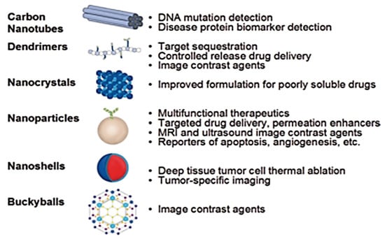 Nanomedicine is a special branch of nanosciences for identifying diseases by a specific diagnosis. The treatment is offered using nanomaterials as agents or biomarkers [8]. Figure 3 represents the various applications of nanotechnology in medical sciences [9]. Highly effective pharmaceutical carriers are essential for simplifying the various health factors and diseases with minimum toxicity to normal tissues. These kinds of necessities prompted extraordinary research in several nano-sized systems, such as liposome structures, for medicinal uses. Bangham explored the categories of several nanoparticles in anticancer applications [10]. The liposomal systems were carried out by many other scientists, and they collectively launched these applications in society for healthy human life. In the development of liposomal-based drugs, specific lipid units play an important role. It significantly increases the pharmacological impacts [11]. The semiconducting nanomaterials, such as ZnO, CuO, and TiO2, are mostly used in drug delivery due to their functionalized stabilities and actions. The functionalized metal-oxide nanoparticles are found more effective towards drug loading and delivery. They have surface modifications and quick actions in biological systems. The decorating surface of such nanoparticles is very studied and commonly employed for biomedical applications, including their confinement effects and surface-to-volume area properties. Apart from the liposomes, CNT, atonic layered structures of carbon (graphene), and its oxides have also been employed. However, silicon-based pure and doped nanomaterials have assembled molecular dendrimers [12]. They have also stabilized micelles systems, noble metal-based nanosystems, and other materials that can also be applied for the efficient delivery of drugs. This is shown in Figure 4. Metal-based nanostructures, including organic and inorganic nanomaterials, have potential in biomedical fields. The efficiency and accuracy of these nano-ranged materials have multiple merits to overcome some serious health issues by the implementation of nanocarriers, markers, and bioimaging. The optical sensitivities and spectral characteristics of such advanced nanomaterials make them reliable for multiple biomedical practices.