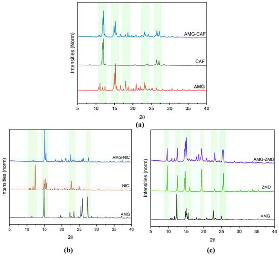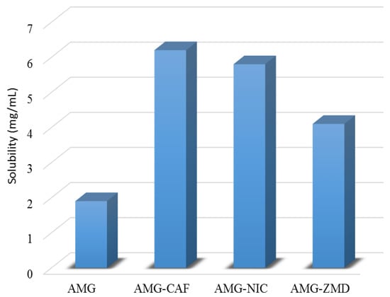 For liquid-assisted grinding, the components of each system were mixed and homogenized for 30 min in a glass mortar and pestle with acetonitrile as the solvent. The AMG-CAF, AMG-NIC and AMG-ZMD systems were produced in their respective eutectic compositions to perform solid-state characterization and solubility tests. In a nutshell, exact weights of AMG-CAF (75 wt.% of AMG), AMG-NIC (50 wt.% of AMG), and AMG-ZMD (50 wt.% of AMG) systems were considered for the solubility evaluation.