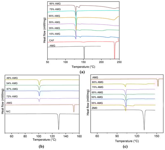 DSC is one essential technique to characterize the solid phase behavior of a material and mixtures. It is crucial to detect the eutectic nature of a multicomponent system as typically the melting point of the eutectic mixture is lower than either of the parent components and the eutectic melting can be identified via the melting events occurring. The DSC patterns of the various AMG-coformer mixtures overlayed with those of the pure components are shown in Figure 3, specifically for the AMG-CAF system in Figure 3a, the AMG-NIC system in Figure 3b and the AMG-ZMD system in Figure 3c.