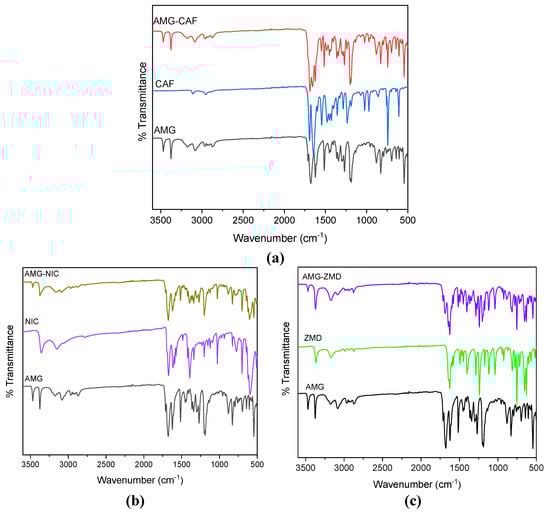Comparison of FT-IR spectra of starting materials AMG and coformer with their respective eutectic composition for (a) AMG and CAF, (b) AMG and NIC, and (c) AMG and ZMD.