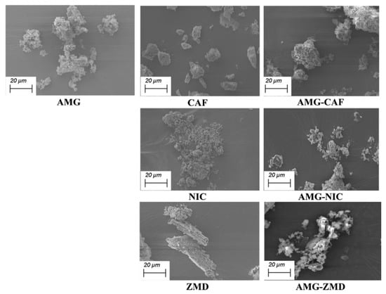 The micrographs obtained from SEM are shown in Figure 5. Even all samples were grinded in a similar way; SEM images contrast the morphological characteristics of the coformers and partly of the AMG, showing some residual crystals left. However, in the eutectic systems i.e., AMG-CAF, AMG-ZMD and AMG-NIC, a noteworthy reduction in particle size is observed with the appearance of strongly agglomerating homogeneous fines as compared to the parent components.