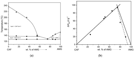 AMG-CAF system. The presence of the single melting endotherm at 127.2 °C (see Figure 3a), lower than that of both the starting components AMG and CAF, indicated the formation of the eutectic composition in the AMG-CAF system at 75 wt.% of AMG. The phase diagram and the Tammann plot for this system are presented in Figure 6a,b. In the phase diagram, the liquidus and solidus temperatures are plotted as a function of weight% (wt.%) of AMG in the CAF-AMG system. It shows the enantiotropic behavior of caffeine and specifies the polymorphic phase transition at ~138°C confirming the literature data [,]. Additionally, this indicates the eutectic composition at ~75 wt.%, which is verified in the Tammann plot (Figure 6b). In addition, the latter indicates a partial solid solution behavior of CAF in AMG in a rather narrow composition range of ~95 ± 2 wt.% of AMG (indicated by the dashed line in Figure 6b). However, since this is based on only two points, it needs to be verified what is hardly to be done in the small existence region of AMG in the phase diagram.
