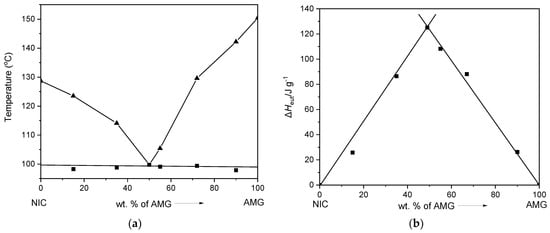 AMG-NIC system. The DSC profiles in Figure 3b illustrate the melting behavior of solid samples at different AMG-NIC compositions prepared by neat grinding. The system shows simple eutectic behavior; thus, mixtures of both components exhibit two endothermic peaks in DSC curves corresponding to eutectic melting and the subsequent dissolution effect of the excess compound. Figure 7a presents the derived melt phase diagram with a eutectic composition of ~50 wt.% AMG. The eutectic temperature in this system was found on average at 99.2 °C (Table 1). The Tammann plot shown in Figure 7b confirms the ~50 wt.% eutectic composition.