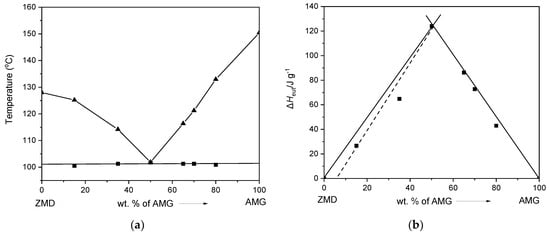 AMG-ZMD system. As for the AMG-NIC system, the melt phase diagram of the AMG-ZMD system is characterized by a simple eutectic, possessing a eutectic point at 101.8 °C and composition of ~50 wt.% of AMG. The eutectic composition was derived from the single endothermic event in the DSC thermogram and from the intersection of the ZMD and AMG liquidus curves. Tammann’s plot (Figure 8b) for the AMG-ZMD system verifies the eutectic composition close to 50 wt.% AMG and indicates partial miscibility at the solid-state close to the ZMD side (indicated by the dashed line in Figure 8b), but similar to the AMG-CAF system, this needs more detailed studies if important.