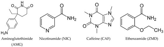In this work, we studied the chiral drug aminoglutethimide [3-(4-aminophenyl)-3-ethyl-2, 6-piperidinedione] (AMG), a nonsteroidal aromatase inhibitor drug, used for the treatment of Cushing’s syndrome, breast cancer, and prostate cancer [,,]. According to the Biopharmaceutics Classification System (BCS), AMG is classified as a BCS class II drug because of its poor solubility []. Attempts were made in this work to create multidrug eutectics of AMG considering caffeine (CAF, a psychoactive drug []), nicotinamide (NIC, a vitamin []) and ethenzamide (ZMD, nonsteroidal anti-inflammatory drug []) as coformers to improve the aqueous solubility of AMG. Scheme 1 shows the chemical structures of AMG and the three coformers. For the synthesis of eutectics, mainly a mechanochemical solvent-assisted grinding (LAG) method has been used. Differential scanning calorimetry (DSC) data is utilized to establish the precise eutectic composition. X-ray powder diffraction (PXRD), Fourier-transform infrared spectroscopy (FT-IR) and scanning electron microscopy (SEM) were applied to characterize the eutectic mixtures and their components. Further, the aqueous solubility of the eutectics was determined and found to moderately exceed that of the parent compound AMG.