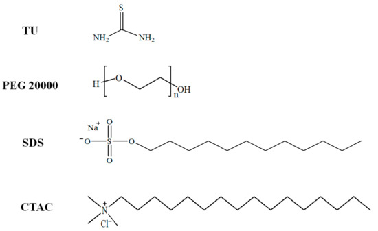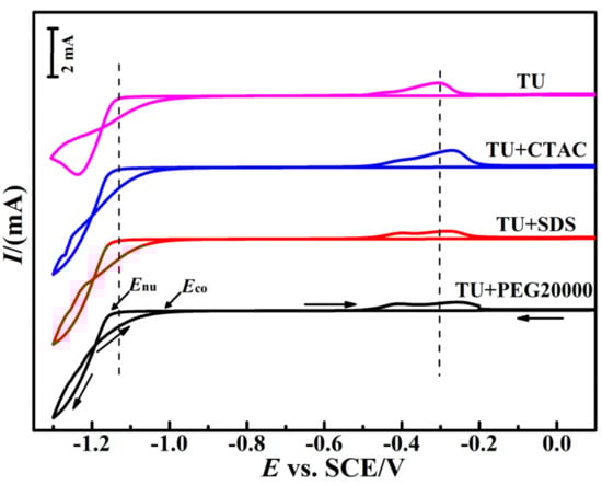 Three different types of substances, CTAC, SDS and PEG20000 purchased from Sinopharm Chemical Reagent Co., Ltd. (Shanghai, China), were selected as additives and compounded with thiourea. Their simple molecular structures are shown in Figure 1. For all experiments, the bath solution used for nickel electrodeposition was freshly prepared and was composed of 0.1 mol/L NiCl2, 0.25 mol/L NH4Cl and 0.4 mol/L NH3·H2O. The additive content for each experiment was 0.2 mmol/L and was added to the electrolytic bath in aliquots from freshly prepared stock solution of 1 mol/L. All chemical reagents were of analytical grade and used directly without any purification. Millipore Milli-Q water (Millipore, Massachusetts Institute, Cambridge, MA, USA, USA) (>18 MΩ/cm) was used in all the experiments. Electrochemical tests were performed on an electrochemical workstation (Shanghai Chenhua Instrument CHI 660E, Shanghai, China) by a conventional three electrode glass cell at 25 °C. A glassy carbon disk (Aida Technology Co., Ltd, Tianjin, China) with a diameter of 3 mm was used as the working electrode. Before use, the working electrode was ground using a fine emery paper, then polished on a polishing cloth with 0.5 μm Al2O3 powder and finally washed thoroughly several times with acetone and alcohol. A saturated calomel electrode (SCE) (model SCE 232, Yueci Electronic Technology Co., Ltd., Shanghai, China) mounted inside a Luggin capillary was used as the reference electrode, so all potentials were referred to this electrode. The reference electrode was placed as close as possible to the surface of the working electrode via the Luggin capillary so as the Ohm drop could be neglected. A platinum sheet of 10 mm × 10 mm was used as the auxiliary electrode. Prior to each electrochemical measurement, high purity nitrogen was bubbled into the bath for 10 min to sparge out dissolved oxygen and maintain an inert atmosphere before electrochemical tests. Cyclic voltammetry tests were carried out from the open circuit potential with a scan rate of 50 mV/s. The stepped potentials for the chronoamperometric measurements were selected from the corresponding CV curves to sufficiently initiate the nucleation and growth of nickel crystals. All the electrochemical tests were conducted at least three times to obtain results with good agreement.