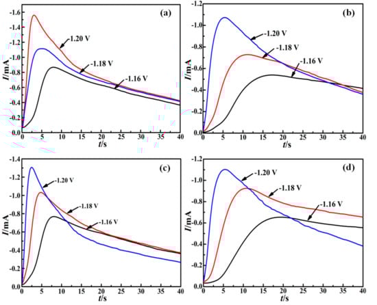 The effect of composite additives on a nickel electrodeposition nucleation mechanism was investigated by chronoamperometry technique, and the potentiostatic current-time transients curves at different potentials are presented in Figure 3. The current peaked in a short time due to the formation and growth of crystal nuclei, then the current decreased gradually from the electron transfer and tended to be flat state at last because of the growth of the nickel nuclei. This shows the typical characteristic of a diffusion controlled electrochemical nucleation process with three-dimensional growth of nuclei and can be characterized by the Cottrell equation in Equation (1) [29]: