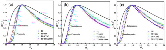 Figure 4 shows that the composite additives did not change the theoretical progressive nucleation mechanism at the step potential of −1.16 V and −1.18 V when compared to single additive thiourea. However, the nucleation mode was ambiguous between instantaneous nucleation and continuous nucleation at step potential of −1.20 V when thiourea was compounded with CTAC or PEG20000. In addition, the nucleation mode of nickel agreed well with the continuous nucleation mechanism when thiourea and SDS were introduced to the bath at the same time.