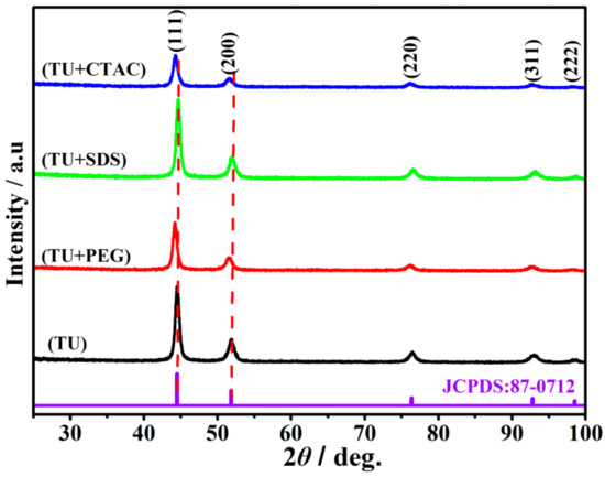 X-ray diffraction was used to further characterize the orientations of nickel deposit samples obtained from different additive-containing baths and the diffraction patterns are shown in Figure 6. Within the diffraction angle from 20° to 100°, all nickel deposits display typical diffraction peaks at 2θ = 44.6°, 51.9°, 76.4°, 92.8° and 98.6°, which correspond to (111), (200), (220), (311) and (222) crystallographic planes of Ni (JCPDS: 87-0712) with face-centered cubic structure. Obviously, the crystal plane (111) has the highest diffraction intensity among the five nickel crystal planes whether or not thiourea was used in combination with other additives. However, the introduction of composite additives weakened the intensity of the diffraction peak of the (111) crystal plane, especially when thiourea was compounded with CTAC. The diffraction peaks of (111) and (200) crystal planes were slightly shifted toward lower 2θ values when thiourea was used in combination with additive CTAC or PEG20000. This slight shift of diffraction peaks may result from the changes of unit cell parameters and crystal plane spacing by the addition of composite additives.