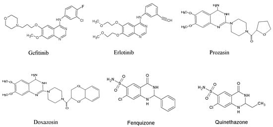 Quinazoline scaffolds also display immense importance for designing and developing some clinically proven and commercially available drugs such as Gefitinib (used against lung cell cancer), Proquazone (a non-steroidal anti-inflammatory drug), Doxazosin (an antihypertensive agent), Prazosin (used to treat high blood pressure), Erlotinib (useful for pancreatic cancer, small cell lung cancer and several other types of cancer), Quinethazone (used to treat hypertension), Febrifugine (used as antimalarial), Afloqualone (used as sedative and muscle relaxant), Fenquizone (used as antidiuretic), and many other pharmacological active drug candidates (Figure 1) [53,54].