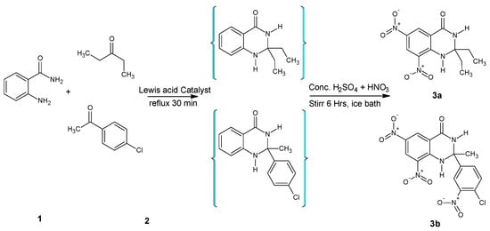 Condensation of anthranilamide with ketone was achieved under Lewis acid catalysis to produce intermediate quinazoline moiety, which was further treated with a nitrating mixture. Resultantly, compounds (3a and 3b) were synthesized by reacting the unsubstituted phenyl ring of 2,3-dihydroquinazolin-4(1H)-one core with conc. HNO3 in the presence of H2SO4 (Figure 2).