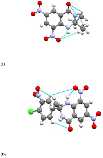 Hydrogen bonding in 3a and 3b (colored lines show H-bonding).