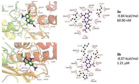 The best binding site for the 3a ligand includes Val19, Asp119, Val121, Asp124, Tyr129, Asn151, Tyr152, Glu154, Lys187, Ser188, Leu198, Val219, Tyr226, Thr227, Gly228, Thr229, Gly230, Asp231, Phe233, Met254, Leu257, and Gln258. Here, the binding site residues contain 228GTGD231 motif and Gln258, which are conserved key residues in PDK [68]. For 3b, the binding site overlapped the 3a active site and consisted of amino acids including, Asn151, Lys187, Ser188, Leu198, Val219, Pro220, Tyr221, His222, Tyr226, Thr229, Gly230, Phe233, Met254, Leu257, Gln258, and Ile261 (Figure 6). The 3b ligand contains 228GTGD231 motif residues and conserved Gln258 and Ile261 residues. Ser188, another conserved residue present in the binding site of both ligands, is involved in the α or β phosphate binding in ATP [68]. MM/PBSA energy calculations using YASARA Structure show a free energy of −94 and −113 KJ/mol for 3a and 3b complex with PDK (Table 3).