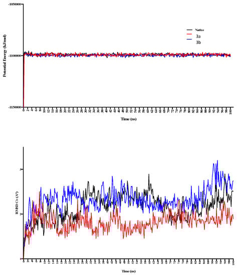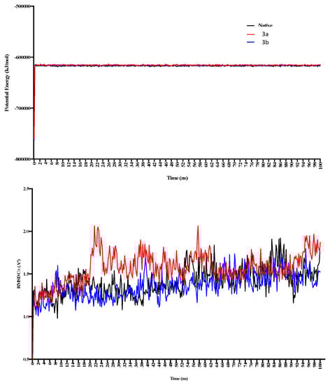 The 100 ns MD simulations for 3a and 3b, where potential energy has been shown in the top panel, while RMSD-Cα is shown in the bottom panel. 3a shows comparatively more significant fluctuations in the complex form during 20–50 ns of simulation.