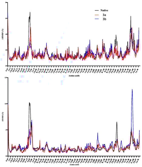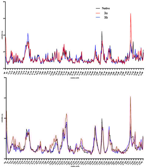 The ligand-protein complexes for 3a, 3b, and native proteins show a comparatively same potential energy, whereas the 3a complex shows the least fluctuations for RMSD-Cα (Figure 10). 3b protein complex shows higher RMSD-Cα changes throughout the 100 ns simulations. Both complexes show RMSD and RMSF changes in the 72–94 amino acids region. However, the active sites of both ligands don’t overlap, and the primary binding site residues don’t include these amino acids. This shows that ligand binding might be affecting this particular region in the enzyme. 3b shows higher fluctuations in RMSF in the 324–335 amino acid region showing ligand interactions with the part of the enzyme binding site (Figure 11). This also indicates that ligands 3a and 3b binding induce some conformational changes in the enzyme.
