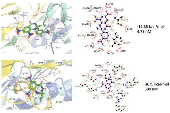 The 3a and 3b binding to the protein structure of Trypanothione Reductase (PDB ID 6T98). The top panels show 3a forms H-bonds with Ala293 (2.71 Å) and Leu294 (3.29 Å). The 3b forms H-bonds with Gly15 (2.75 Å), Gly16 (3.26 Å), Ser162 (3.5 and 3.13 Å), Arg287 (2.23 Å), and Arg290 (3.52 Å). (Hydrogen bonding is shown by light green color dotted lines).