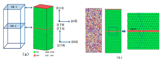 With the rapid development of industry, traditional materials no longer satisfy higher requirements. Research scholars began to pay more attention to high-entropy alloys (HEAs) with high strength, high hardness [1], high wear resistance [2], corrosion resistance [3,4], and suitable thermal stability [5]. HEAs are mixed entropy alloys composed of five or more kinds of elements according to the proportion of equimolar or near equimolar atoms [6]. It generally forms a stable single-phase solid solution, which may be face-centered cubic crystal structure (fcc), body-centered cubic crystal structure (bcc), hexagonal close-packed structure (hcp), or an alloy of two phases [7,8], sometimes nano-phase or even amorphous phase of a class of alloys. Among many kinds of HEAs, the HEAs with fcc crystal structure have considerable stretch plasticity and multiple strengthening mechanisms, and it is gradually becoming the current hot research area in the field of HEAs [9,10]. Thota et al. [11] observed Σ3, Σ9, and Σ27 grain boundaries when they researched the microstructure of as-recrystallized specimens in CoCrFeMnNi HEAs. Chen et al. [12] explains that in FCC alloys, special boundaries were mainly composed of Σ3ns boundaries for CoCrFeMnNi HEAs. Li et al. [13] confirms stacking faults and dislocations present even in the as-homogenized state of the FCC γ matrix in Fe20Mn20Ni20Co20Cr20 HEAs. Zhao et al. [14] also simulated the influences of Σ3, Σ5, and Σ11 grain boundary on materials performance for CuNiCoFe HEAs. In this paper, Al0.1CoCrFeNi HEAs, as typical HEAs as the research object, have a single-phase fcc crystal structure [15]. The deformation process during the tensile test is comparatively studied. For fcc crystal structure, grain boundary energy for Σ3 grain boundary is lowest [16]; as a result, a Σ3 grain boundary is easy to appear in the fcc crystal structure. Therefore, Al0.1CoCrFeNi HEAs with Σ3 grain boundary are studied as a subject.