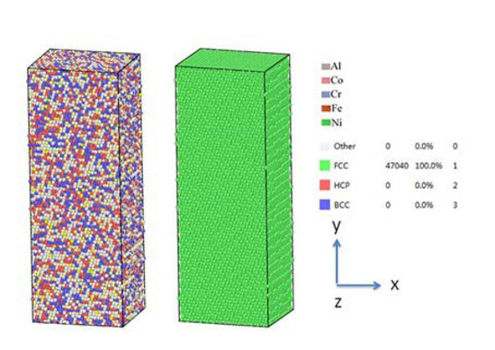 The strain rate of the simulated conditions is much larger than that of the actual process. The effects of strain rate and grain boundary on the mechanical properties of HEAs are mainly studied. After each loading, the atomic configuration and stress-strain values in the model are recorded.
