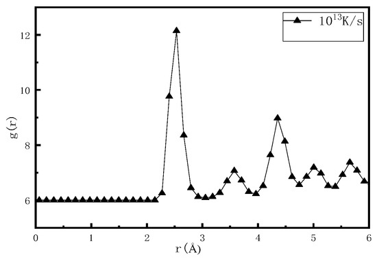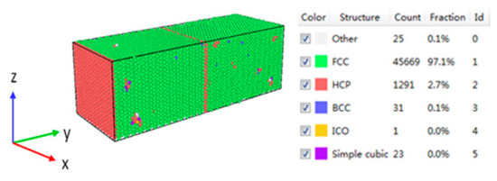 To eliminate the boundary effect, periodic boundary conditions are adopted. Because the grain boundary structure itself is unstable structure, static relaxation is needed. After static relaxation, minimizing the energy of the system, the grain boundary structure reaches a stable state. An embedded atom method (EAM) [23] is used to describe the force between atoms, and the timestep is set to 0.001 ps. After the model was built, it was heated above the melting point and cooled at a cooling rate of 1011 K/s to room temperature. As a result, the equilibrium structure was obtained. Figure 3 shows the common neighbor analysis (CNA) of Σ3 GBs HEAs after solidification. We can conclude that the main crystal phase is fcc (97.1%) and a small amount of hcp (2.7%), and bcc (0.1%). The radial distribution function during the solidification process is drawn as shown in Figure 4. The splitting appears in the second peak shape of the curve, which indicates that the system has typical characteristics of a crystalline state. They are consistent with the experimental results [14], which prove the correctness of the model structure and potential function and provide support to predict and analyze the deformation mechanism of Al0.1CoCrFeNi HEAs.