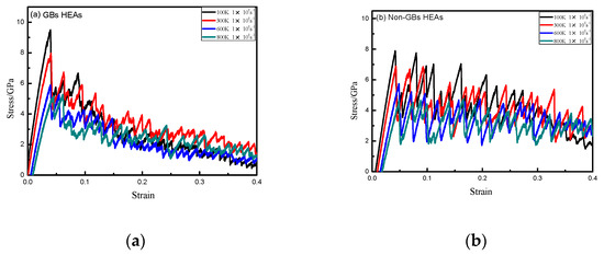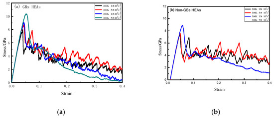 Stress-strain curves of deformation process at different strain rates of HEA. (a) GBs HEAs; (b) non-GBs HEAs.