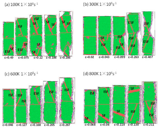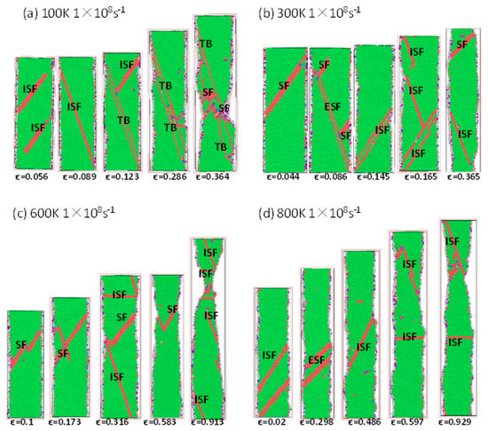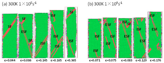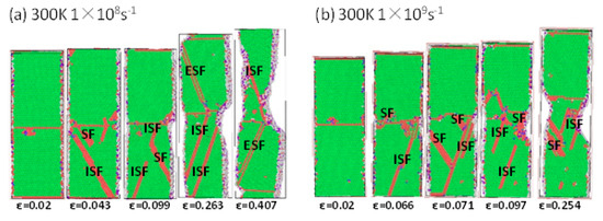 In order to research the morphology of crystal defects in plastic deformation of HEAs, the deformation mechanism of HEAs is analyzed by observing the atomic configuration diagram of high-entropy alloy by CNA diagram. The atomic structure diagrams with strain rates of 1 × 108 s−1 and 1 × 109 s−1 are selected, respectively, which was shown in Figure 6. Green is the fcc crystal structure, and red is the hcp crystal structure. The single-layer hcp structure is twinned (TB). Two adjacent hcp are intrinsic lamination (ISF), multiple hcp connected together are stacking fault (SF), and one layer between two hcp layers represents extrinsic lamination (ESF) [15].