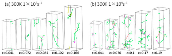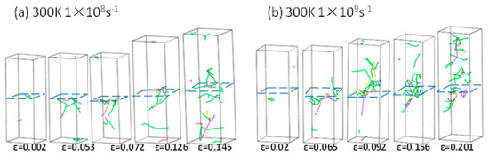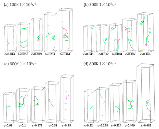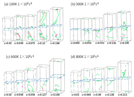 The main dislocation is of Σ3 GBs HEAs, and non-GBs HEAs is1/6<112> Shockley partial dislocations in Figure 8 and Figure 9, and the dislocation density of both types of HEAs increases with the increase in strain rate. The strain rate is 1 × 109 s−1 (Figure 7). It is found that 1/6<112> Shockley partial dislocations first nucleate at the grain boundary when the strain is 0.02. As the deformation continues, the dislocations proliferate and slip into the crystal, and the crystal begins to deform. At the DXA diagram of strain 0.065, it can be seen that when the dislocation slips to the other side of the grain boundary, the dislocation movement is hindered. Because the atoms on the grain boundary have different orientations, it is difficult to continue to slip and is forced to pile up at the grain boundary. The microstructure of the dislocation line of non-GBs HEAs is shown in Figure 9. The strain rate is 1 × 108 s−1. The strain increases from 0.041 to 0.166, the length of the dislocation increases with the increase in strain. The dislocations in the tensile deformation of the non-GBs can be extended in the whole model without being hindered by grain boundaries.