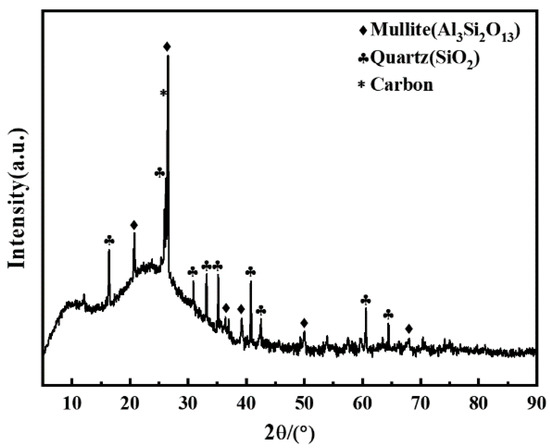 The CFA and SrSO4 powders (AR grade) were utilized as the starting materials. The CFA was sourced from the thermal power plant in Hunan, China. After being oven-dried at 105 °C for 24 h to remove absorbed water, the CFA was passed through a 200-mesh screen. The phase composition of the CFA was characterized by X-ray diffraction (XRD), as shown in Figure 1. Moreover, the chemical composition of the preprocessed CFA characterized by X-ray fluorescence (XRF) was present in Table 1. It can be observed that the CFA has high contents of SiO2 (57.06 wt.%) and Al2O3 (29.13 wt.%) with only trace amounts of other oxides and carbon.