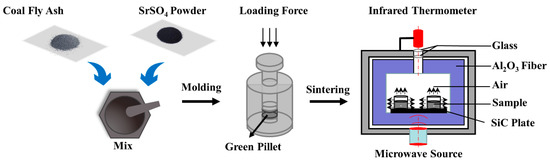 The refined CFA was mixed with SrSO4 in equal proportion (0 wt.%, 5 wt.%, 10 wt.%, 15 wt.%, 20 wt.%, 25 wt.%, and 30 wt.%) to obtain Sr-contaminated soil, denoted as S0, S5, S10, S15, S20, S25, and S30, respectively. Subsequently, the mixtures were wet ground in a mortar with alcohol as the medium. After being ground uniformly, the homogenized mixtures were dried again and then pressed into pellets of 10 mm in diameter and 3 mm in thickness by the cold isostatic pressing under 200 MPa. Finally, the samples held by alumina crucibles were sintered at 1100 °C, 1200 °C, and 1300 °C for 30 min in a microwave muffle furnace under air atmosphere. The samples were firstly heated at 800 °C for 60 min to burn out the carbon and remove volatile components. As the temperature below 1000 °C, the heating rate was set to 20 °C/min and then reduced to 10 °C/min as the temperature beyond 1000 °C. After being maintained at target temperatures for 30 min, the sintered matrices were naturally cooled down to room temperature. The whole experimental process was shown in Figure 2.