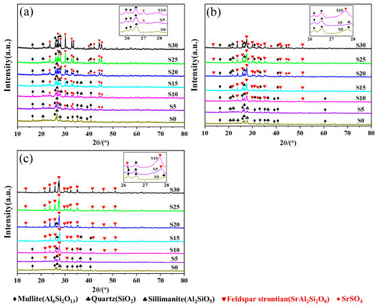 Figure 3 presents the XRD patterns of as-sintered samples doped with 0–30 wt.% of SrSO4 in the temperature range of 1100–1300 °C for 30 min. Figure 3a displays the XRD patterns of the sintered forms loading 0–30 wt.% SrSO4 fabricated at 1100 °C. Evidently, the SrSO4-related phase can be found in all the sintered matrices, indicating that the SrSO4 could not be immobilized in the sintered samples at 1100 °C. As demonstrated in Figure 3b, the diffraction peaks of feldspar strontian (SrAl2Si2O8) are detected with the elevation of sintering temperature. Moreover, the main crystalline phase transforms from mullite and sillimanite to feldspar strontian with increasing SrSO4, indicating that the SrSO4 could be incorporated in the sintered matrix. Analogous results are shown in Figure 3c. The difference is that, as the firing temperature increases from 1200 °C to 1300 °C, the number of diffraction peaks of feldspar strontian increase. The diffraction peaks of quartz and sillimanite both decrease, which may be ascribed to the involvement of SiO2 and Al2O3 in the synthesis of SrAl2Si2O8. What is interesting in Figure 3b is that a few diffraction peaks of SrSO4 are detected in the sintered samples at 1200 °C as the doping amount of SrSO4 increases to 20 wt.%, which suggest that the maximum solid solubility of SrSO4 at 1200 °C is between 15 wt.% and 20 wt.%. As the sintering temperature elevates to 1300 °C, the SrSO4-related phase has not been found in all the sintered compacts, implying that the maximum solid solubility of SrSO4 at 1300 °C is over 30 wt.%.