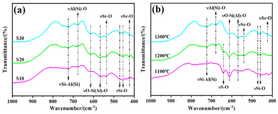 The FT-IR technique is utilized to further reveal the immobilizing modes of Sr element in sintered matrix. Figure 4a demonstrates the FT-IR spectra of the samples doped with various contents of SrSO4 prepared at 1300 °C. Obviously, the main absorption peaks of the sintered samples are concentrated in the range of 400 cm−1 to 800 cm−1. The absorption peaks at ~470 cm−1 and ~456 cm−1 are attributed to the stretching vibrations of Si-O bonds [21,22]. The absorption peaks at ~725 cm−1 and ~673 cm−1 are ascribed to the stretching vibrations of Si-Al (Si) and Al (Si)-O bonds, respectively [23]. The remaining part of the spectrum contains the modes of the bending vibrations of O-Si (Al)-O bonds (around 610 cm−1 and 576 cm−1) and O-Si-O bonds (near 540 cm−1 and 420 cm−1), and the stretching vibrations of Sr-O bonds (near 540 cm−1 and 420 cm−1) [3]. Combined with the XRD results, the existence of Sr-O bonds indicates that feldspar strontian is present in the sintered samples. Analogous results are shown in Figure 4b. The difference is that, the S-O bonds at ~640 cm−1 are detected at 1100 °C and 1200 °C, indicating the existence of SrSO4 [24]. As the firing temperature increases from 1200 °C to 1300 °C, the S-O bonds are disappeared. It could be deduced 30 wt.% SrSO4 could not be fully incorporated in the sintered matrices at 1100 °C and 1200 °C, whereas the maximum solid solubility of SrSO4 at 1300 °C is over 30 wt.%.