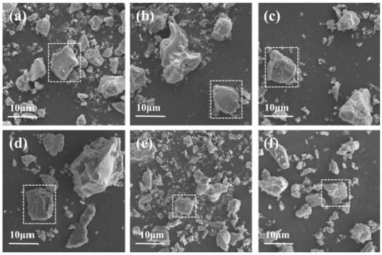 Microscope analyzed by SEM: (a) 1100 °C, 20 wt.% SrSO4, (b) 1200 °C, 20 wt.% SrSO4, (c) 1300 °C, 20 wt.% SrSO4, (d) 1100 °C, 30 wt.% SrSO4, (e) 1200 °C, 30 wt.% SrSO4, and (f) 1300 °C, 30 wt.% SrSO4.
