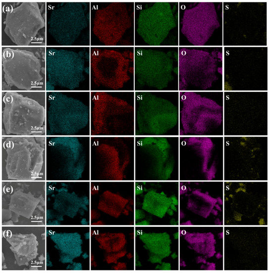 The SEM and corresponding elemental mapping images of the typical samples are presented in Figure 5 and Figure 6, respectively. As illustrated in Figure 5, many grains with dimensions of 5–10 µm are observed. The ceramic is inferred to be feldspar strontian (SrAl2Si2O8) according to the above XRD results. The corresponding elemental mapping of the main elements (Sr, Al, Si, O, and S) is demonstrated in Figure 6. It is evident from Figure 6a,b,d,e that the S element is distributed with obvious enrichment. It implies that SrSO4 could not be fully fixed under these conditions, which is consistent with the phase analysis results in Figure 3. On the contrary, all the elements are evenly distributed without obvious enrichment in Figure 6c,f. Combined with the above XRD analysis, the elemental mapping results are valuable to certify that at least 30 wt.% SrSO4 could be successfully incorporated in the sintered samples obtained by microwave preparation at 1300 °C for 30 min.