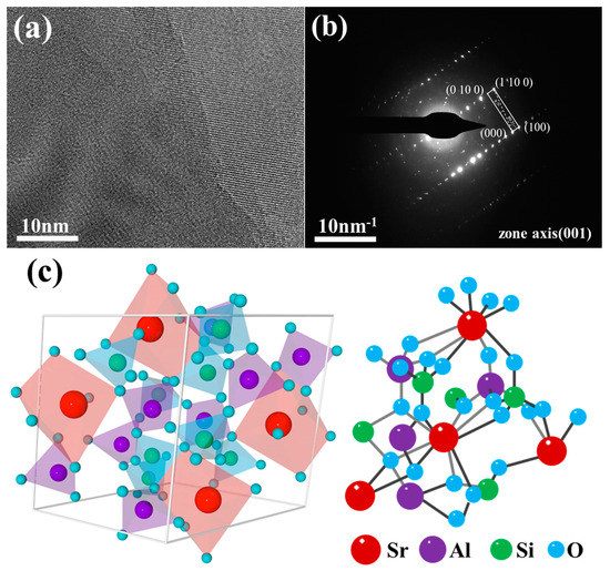 TEM image (a) and SAED pattern (b) of S30 sintered at 1300 °C, and (c) crystallographic information of SrAl2Si2O8.
