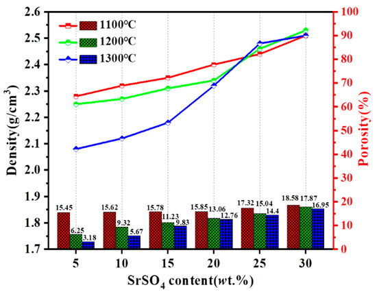Figure 8 shows the density and open porosity of typical samples sintered at 1100 °C, 1200 °C, and 1300 °C. It can be found that the density of all sintered samples increases with an elevated doping amount of SrSO4. When the doping amount is 30 wt.% and the sintering temperature reaches 1200 °C, the density reaches the maximum value (2.53 g/cm3), which satisfies the density requirement of radioactive waste packages (>2.5 g/cm3) [25]. However, when the doping amount of SrSO4 is below 25 wt.%, the density of all sintered samples decreases with the increase of sintering temperature. It might be ascribed to the increasing involvement of Sr2+ in the reaction with Al3+ and Si4+ to form the SrAl2Si2O8 as the temperature increases which leads to more vacancies. It is in agreement with above XRD and FT-IR results. The open porosity of all sample is maintained at a relative high level, which is attributed to the presence of carbon and volatiles in the CFA. With the increase of sintering temperature, the open porosity decreases, implying that the elevation of sintering temperature is conducive to densification.