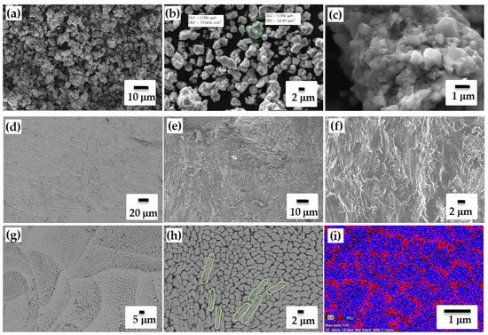 SEM images of MoSi2-10 wt.% Si powder (a–c); SEM images of the surface (d,g,h); and cross-section (e,f) with different magnifications, EDS mapping of surface (i).