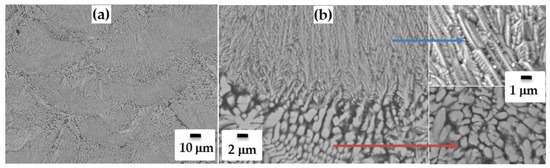 The SLM process was utilized to prepare high density Mo(Si1−x,Alx)2 based composites of hardness exceeding 500 HV1 from the mixture of combustion synthesized MoSi2 powder and AlSi10Mg alloy. MoSi2 represented 1–5 micron-sized particles with frequent agglomerates (D50 = 18 μm) and AlSi10Mg alloy contained satellite particles of spherical and occasional morphology with Gaussian size distribution concentrated on 38 μm. The surface finish and chemical and microstructural homogeneity of the coupons produced at both 150–200 W laser power and 400–500 mm∙s−1 scan speed and at 250 W laser power and 700 mm∙s−1 scan speed were admissible. Relatively low roughness for the horizontal and vertical surfaces indicated the fair quality of the sintered parts. The microstructure evolution of an SLM-fabricated MoSi2-AlSi10Mg part exhibits a characteristic scalloped structure pattern due to fast melting and rapid solidification in the direction of the laser (Figure 3). Each scallop comprises fine columnar dendritic structures and elongated grains with a fine divorced cellular structure (~1 μm). The formation of this unique structure occurs during the interaction of material with laser. Fine columnar dendrites of hexagonal Mo(Si1−x,Alx)2 ceramic encircled by hypoeutectic Al0.85Si0.15 phase are formed; simultaneously, the substituted Si fuses, dissolves, and precipitates at grain boundaries, collapsing the cellular structure and ripening the overall microstructure [56,57]. The size and distribution of nanosized precipitates and cellular structures have a profound effect on mechanical properties, as demonstrated by the enhanced microhardness of the samples (~600 HV1).