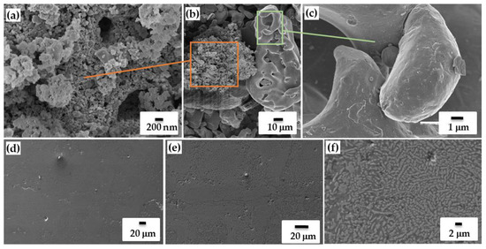 The preparation TiB2/Si powder of specific morphology by combustion reaction may considerably promote the melting and solidification during sintering (Figure 4c). Indeed, in the SLM process, the TiB2 ceramic phase and silicon acquire mutual affinity without the formation of any chemical bonds, thereby contributing to the consolidation process without spurious phase formation. TiB2/Si coupons of geometric density from ~87 to ~97% were additively manufactured by the SLM technique changing the laser current in the range 1400–2200 mA. A laser current of high intensity (I > 2200 mA) was required for the fabrication of dense compacts of Vickers microhardness around 8 GPa. This is explained by the decrease of the viscosity of liquid silicon along with increase in laser current. As a result, Si inclusions are homogeneously distributed between the TiB2 particles preliminary stimulated by the “pomegranate-like” morphology of the feedstock. Fine-grained titanium diboride particulates render the role of nucleation seeds upon the cooling process and, due to the “pomegranate-like” microstructure, lend a hand to the more homogeneous solidification of silicon melt, thereby making it possible to prevent Si grain coarsening and decrease the risk of cracking at shrinkage. TiB2/Si composite microstructure is composed of micron-sized columnar grains (2–10 μm in length) and equiaxed submicron grains of ceramic phase dispersed in the Si matrix (Figure 4d–f).