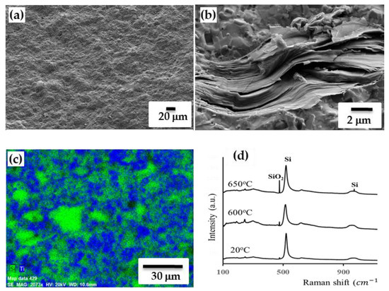 Aside from SLM, the SHS synthesized TiB2 + Si and TiB2 + 2Si composites were sintered in graphite crucibles at different temperatures (ranging from 1250 to 1350 °C) [59]. Fully dense coupons of flat surface and fracture were successfully produced (Figure 5a). The highest hardness up to 11 GPa of TiB2-Si composite sintered at 1350 °C was achieved at lower Si content. The hardness of solid bulks produced by SLM of SHSed TiB2/Si composites of a relative density around 97% (7.6 ± 1 GPa) was comparable with that of SPSed samples sintered at 1300 °C (7.2 ± 0.5 GPa). The fracture toughness of the composite determined by different techniques ranges from 3.73 to 5.71 MPa·m1/2 for the TiB2/Si samples consolidated at 1300 °C. The average FT value is commensurate with TiB2-SiC-Si composite with representative FT value of 3.5 MPa·m1/2. The absence of notable chemical interaction between the constituents during the consolidation process was revealed by XRD examinations: after the sintering pattern comprised only the characteristic lines of TiB2 and silicon. Microstructural analysis showed that TiB2 particulates predominantly have rounded morphology inherited from the SHS process (Figure 5c). However, average size of fine grains (calculated for at least 100 grains) was around 0.5 µm and for the coarse particles, 3 µm, suggesting ceramic particle coalescence during the sintering. The bulk samples with lower silicon amount (~30 wt.% vs. 44 wt.%) demonstrated the lowest wear rate when subjected to erosion by silica sand in the whole temperature interval (20–650 °C). The layer composed of silica was formed to protect further oxidation and decrease the wear at elevated temperatures. The oxide formation on the surfaces of samples was examined by Raman spectroscopy. The characteristic bands on Raman spectrum of TiO2 are on 145, 198, 399, 516, and 640 cm−1, and rutile on 240, 443, and 619 cm−1 and they are not observed in the samples up to 650 °C. SiO2 formation started to be observed from 600 °C (Si-O-Si network bending modes at 485 cm−1).