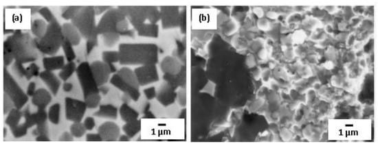SEM examinations of fractures of cermets derived by combustion reactions at (a) Tad = 2950 K and (b) Tad = 1730 K. Reprinted with permission from Anselmi‐Tamburini et al. (1998), Copyright 1998 Journal of the American Ceramic Society [67].