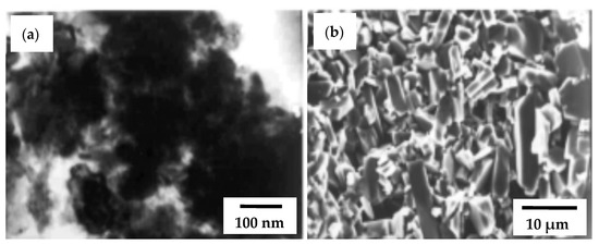 TEM image of SHS TiB2 powder (a) and SEM fracture of TiB2 pellet sintered at 2123 K (b). Reprinted with permissiion from Khanra et al. (2005), Copyright 2005 Journal of the American Ceramic Society [69].