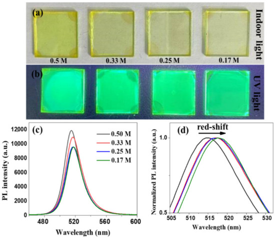 Photoluminescence (PL) characterization was performed on the films formed by different concentrations of perovskite precursor solutions, and the four PL spectral curves are shown in Figure 1c. The PL intensity of the film with the concentration of 0.5 mmol/mL (M) was the highest. This matches the results obtained from the UV light irradiation of the real object. With the decrease in concentration of the perovskite precursor solution, a slight red shift of the PL spectral peaks can be seen, in Figure 1d, which is possibly due to local variations of the perovskite grain sizes and defect conditions [24,25,26].