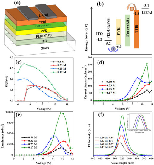 (a) The device structure of the perovskite light-emitting diode and (b) the energy band diagram of each functional layer of the device. The luminescence characteristics of the PeLEDs prepared with different concentrations of perovskite precursor solutions: (c) voltage–external quantum efficiency (EQE) curves; (d) current density–voltage curves; (e) Luminance–voltage curves; and (f) EL intensity curves. The inset shows the normalized EL curves.