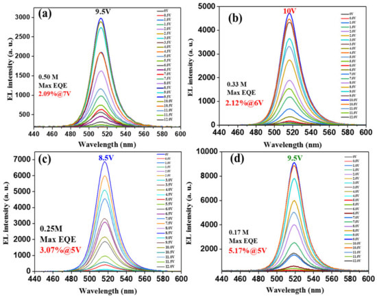 To further investigate the EL characteristics of the PeLEDs made with different perovskite precursor concentrations, the EL intensity curves were obtained by increasing the voltage from 3 to 12 V, as shown in Figure 3. When the driving voltage was increased from 3 V to 12 V, the EL intensity of the PeLEDs prepared with four different concentrations of the perovskite precursor solutions increased to the maximum, and then decreased; however, there was no peak shift in the EL spectra, which means green luminescence with high color purity was obtained. With the decrease in the concentrations of the perovskite precursor solutions, a relatively high EQE of the device can be obtained at a relatively low driving voltage, with the maximum luminance increasing from 1667 cd/m2 to 9857 cd/m2 and the current efficiency increasing from 6.7 cd/A to 19 cd/A. The detailed performance parameters are summarized in Table 1.