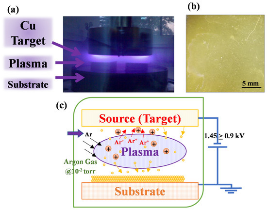 (a) Plasma assisted coating in the sputtering chamber, (b) Stereoscopic optical image of Cu coated sample, (c) Schematic representation of the sputtering phenomenon.