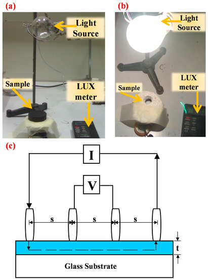 (a) Side view of setup to measure the transmitted Light intensity, (b) Top view with light source turned on, and (c) Schematic of Four probe system.