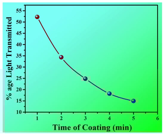 Figure 3 shows a graphical illustration of the relationship between coating time and percentage light intensity transmitted. The observed percentage of light transmitted at 1 min is 53 percent, as can be seen. However, as time passes, the percentage of light transmittance decreases. The percentage of light transmitted through the coated samples decreases as the coating duration rises, as shown in this graph. This demonstrates that the coating thickness grows as the coating duration increases.