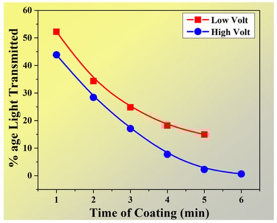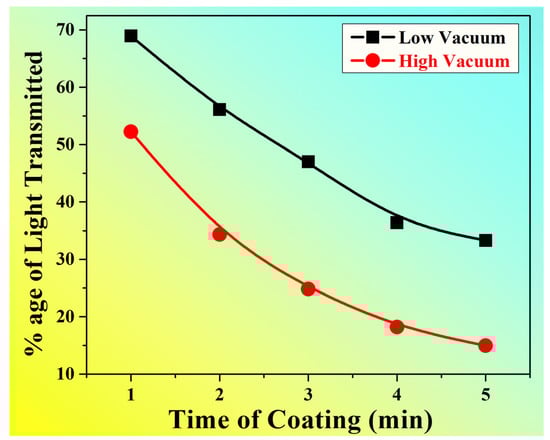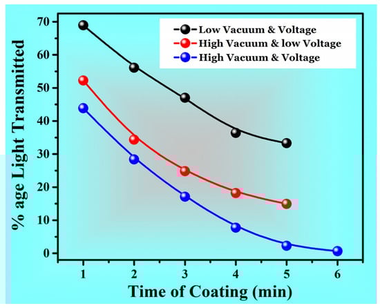 Figure 6 depicted the percentage light transmittance as a function of voltage at various time intervals. It is clear from this graph that the light transmittance of the coating obtained after 6 min is almost zero. The substrate coated for 12 min at high voltage “1.45 KV” and high vacuum pressure “10−1 torr” is almost opaque even at the source intensity of 700 Lux. When all three coating categories are compared, it is obvious from Figure 6 that the coating at high vacuum and high voltage is the best of all.