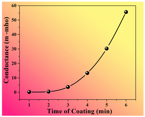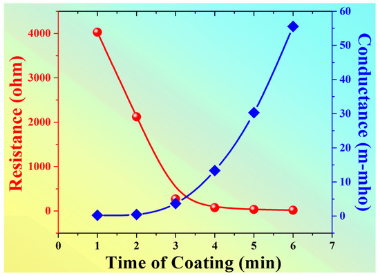 Figure 8 depicts the relationship between coating resistance and conductance. As illustrated in Figure 8, this is further confirmed by comparing the conductance of the coatings with their resistance. The maximum resistance of 4000 ohm was obtained for a 1 min coated sample, while the conductance of a 6 min coated sample was surged to 56 m-mho. The conductance of the samples increased over time, indicating that the coating thickness is directly proportional to the conductance and eventually inversely proportional to the resistance of the produced films.